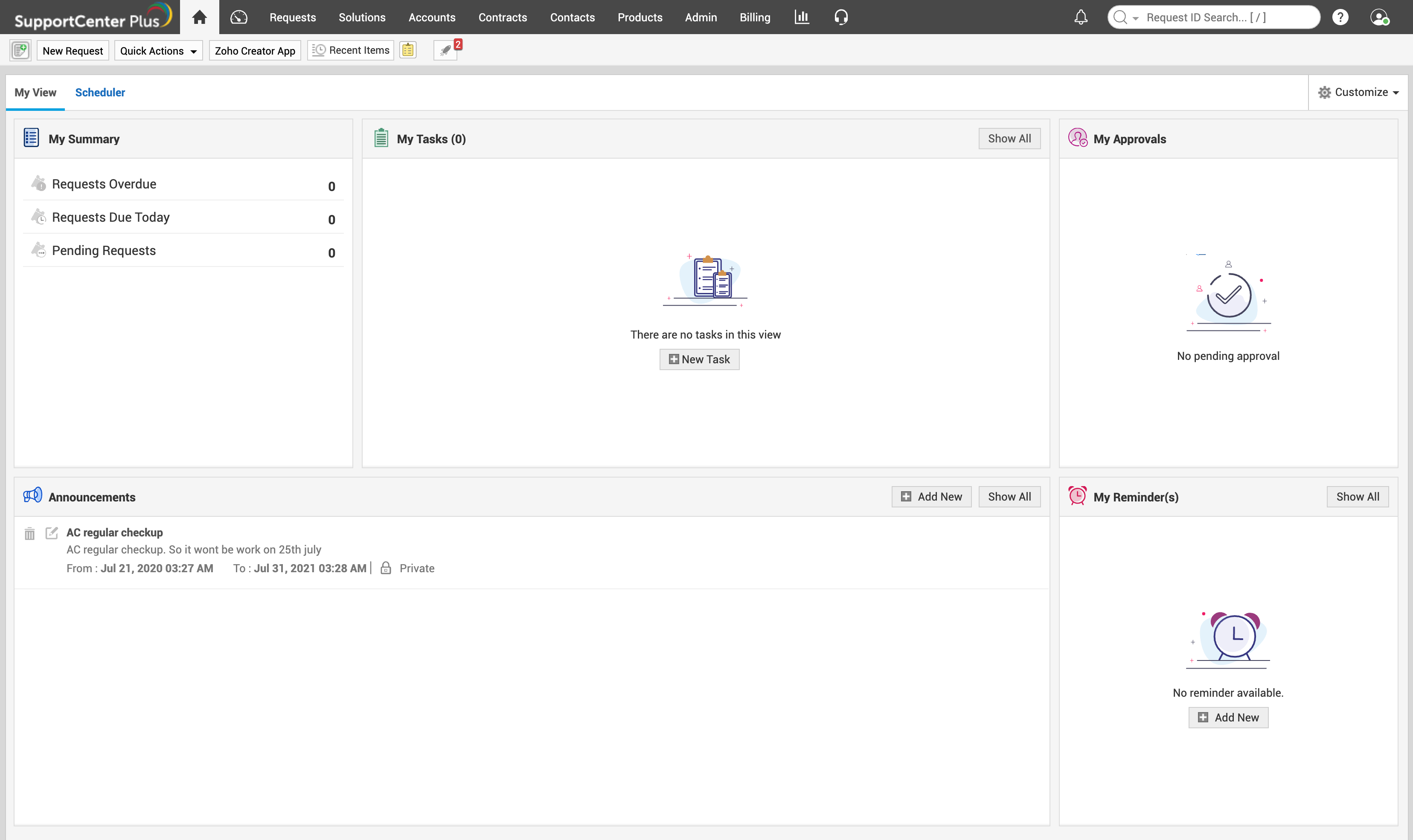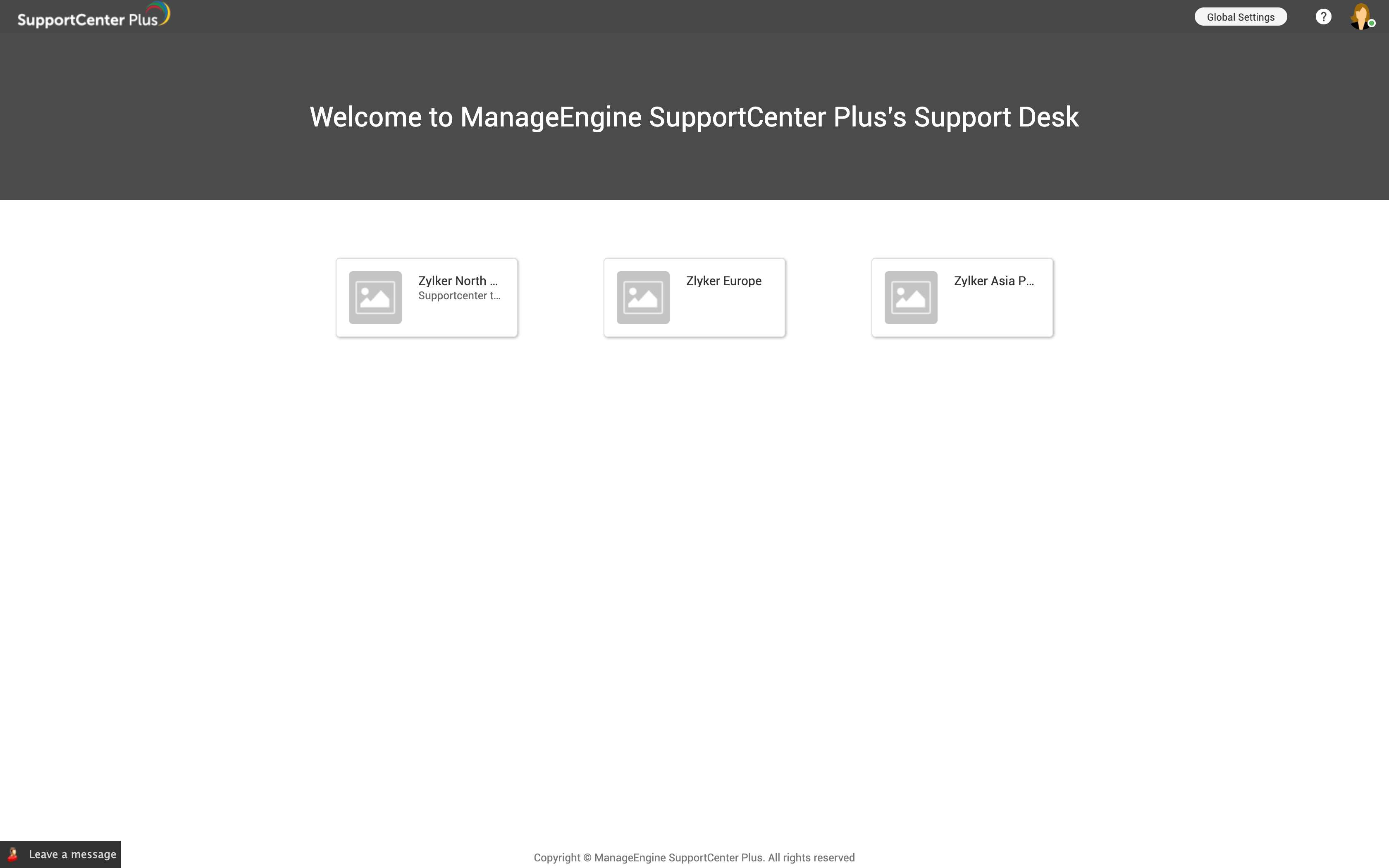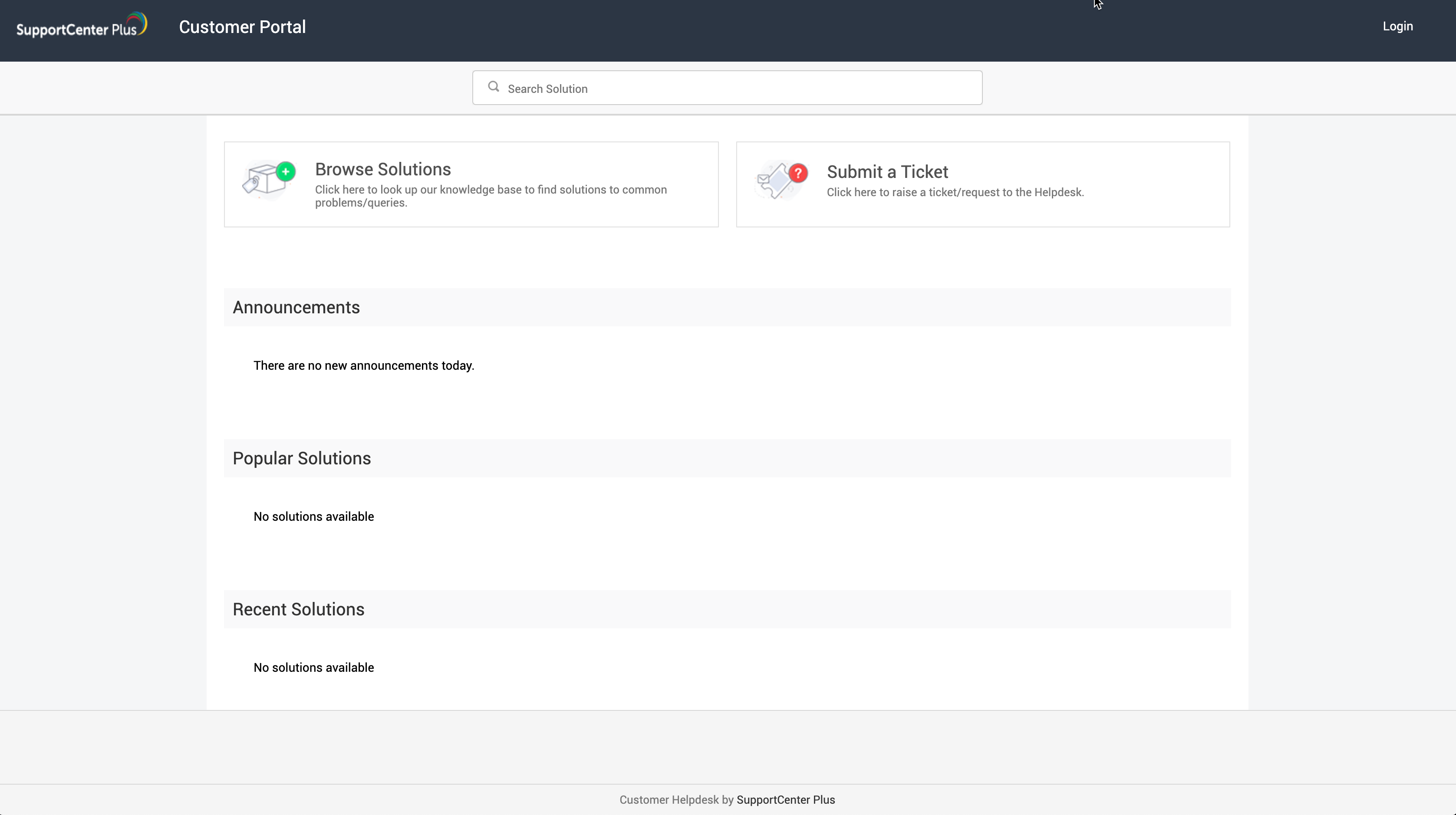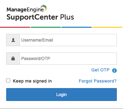 SupportCenter Plus provides a common login page for all users. A valid login credential is required to access the application. After a successful login, the user will be directed to the help desk or self-service portal depending on the role. Users with any help desk role will be directed to help desk and contacts will be directed to the self-service portal.