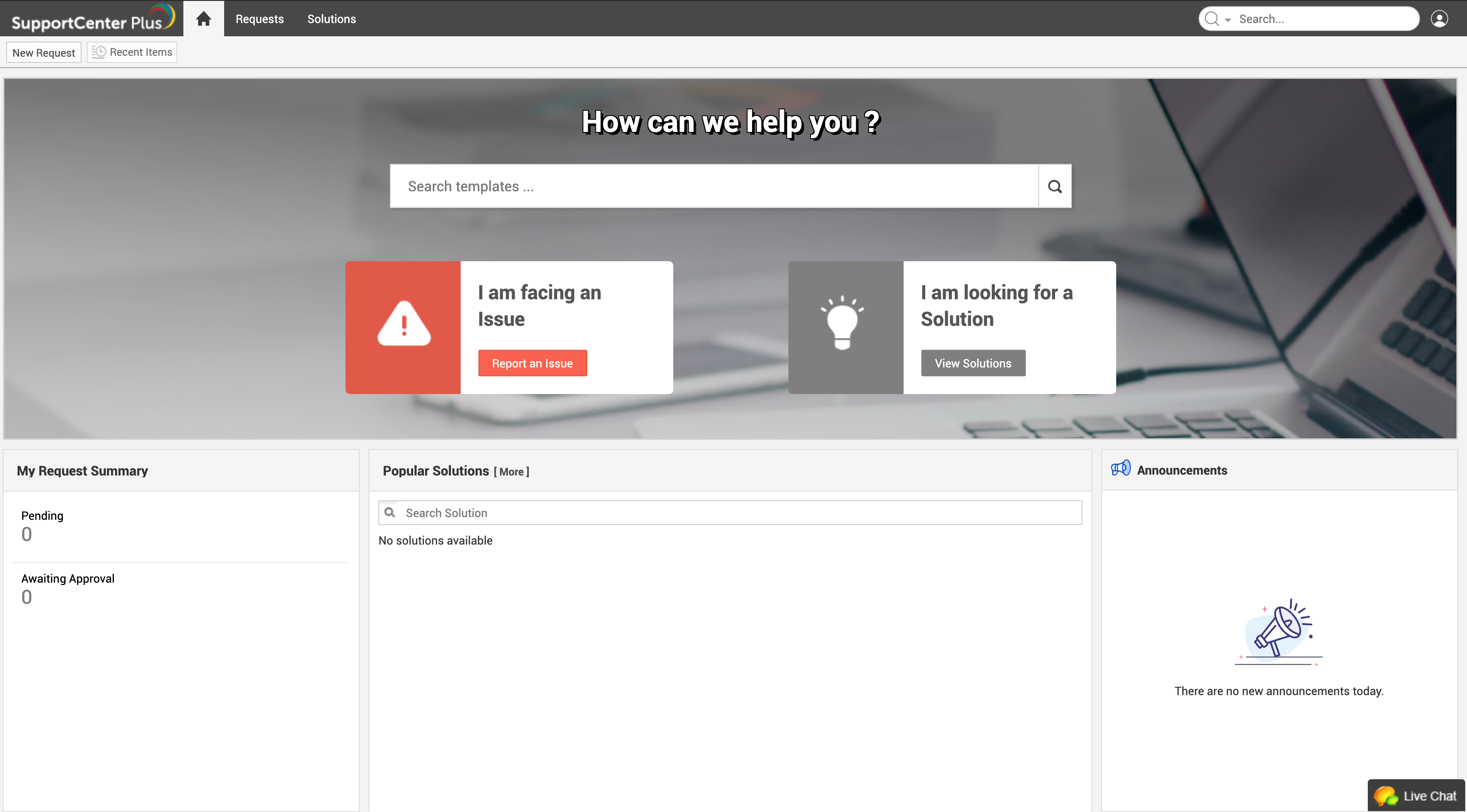The header pane provides a tabbed interface to access the home page, request, and solution modules.