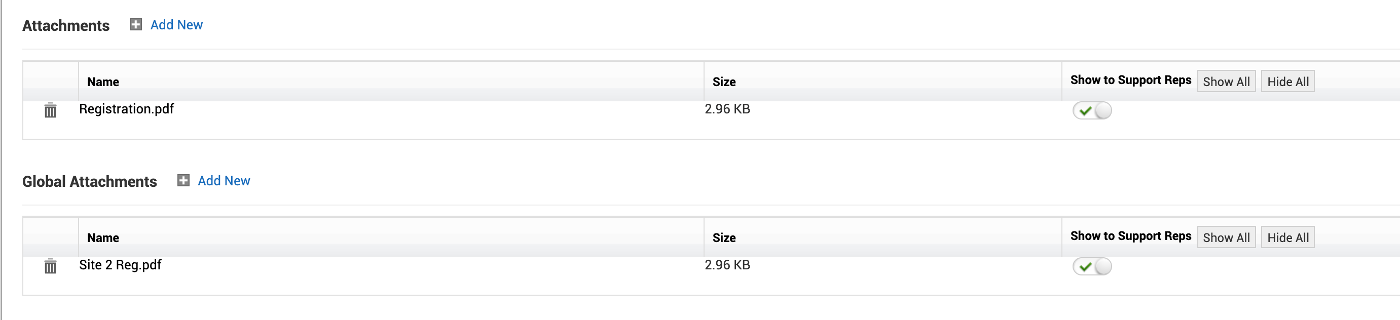 - By default, the attachments are visible to all support reps. You can modify it using Show to Support Reps toggle button in the corresponding attachment section.