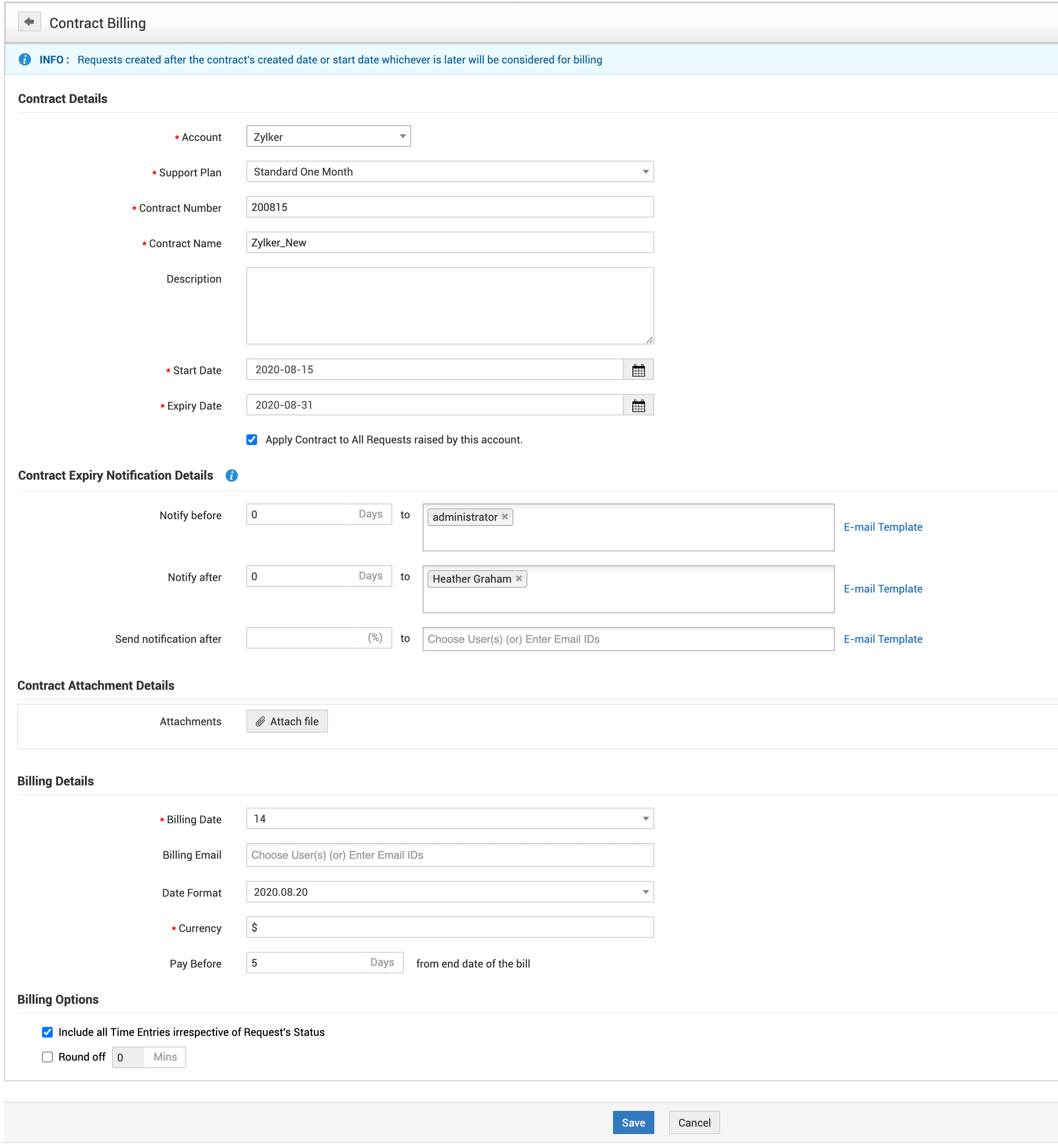 Contract Expiry Notification Fields: Notify before, Notify after, Send notification after(%) |
