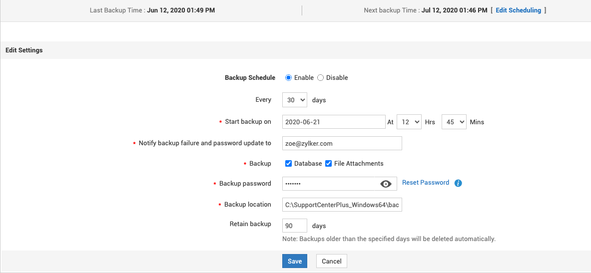 SupportCenter Plus allows you to schedule a periodic backup of the application. This is an application-wide configuration.