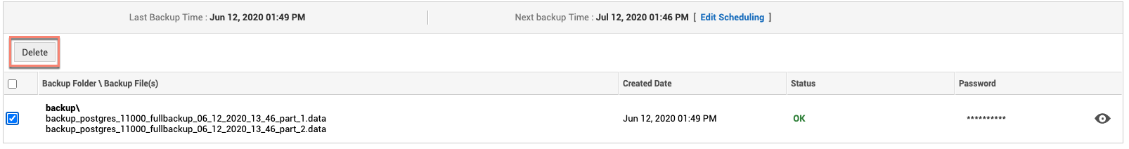 All back up files are listed under backup configuration page. To access it, go to Admin>>General Settings>>Backup Scheduling (if only one portal is configured) or go to Global Settings>>General Settings>>Backup Scheduling (if multiple portals are configured).