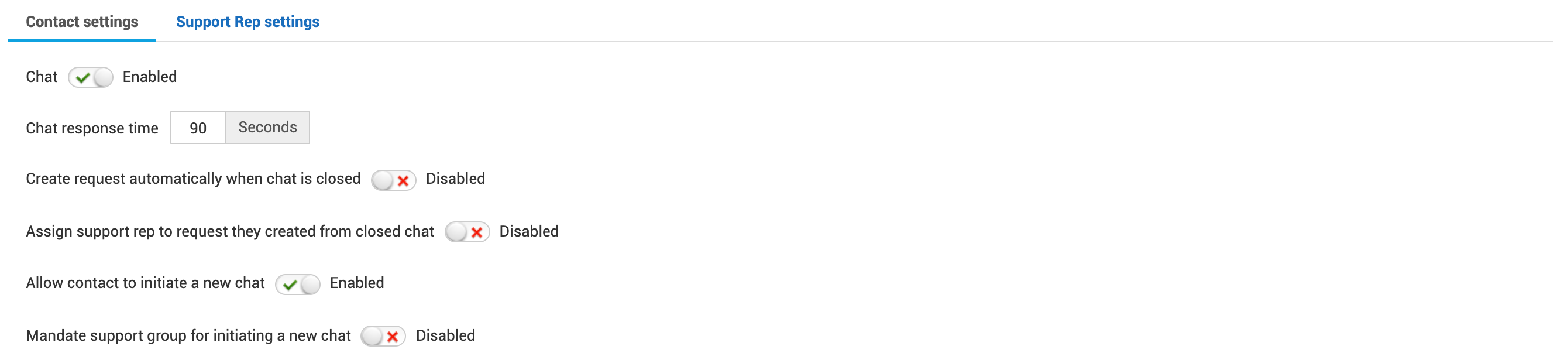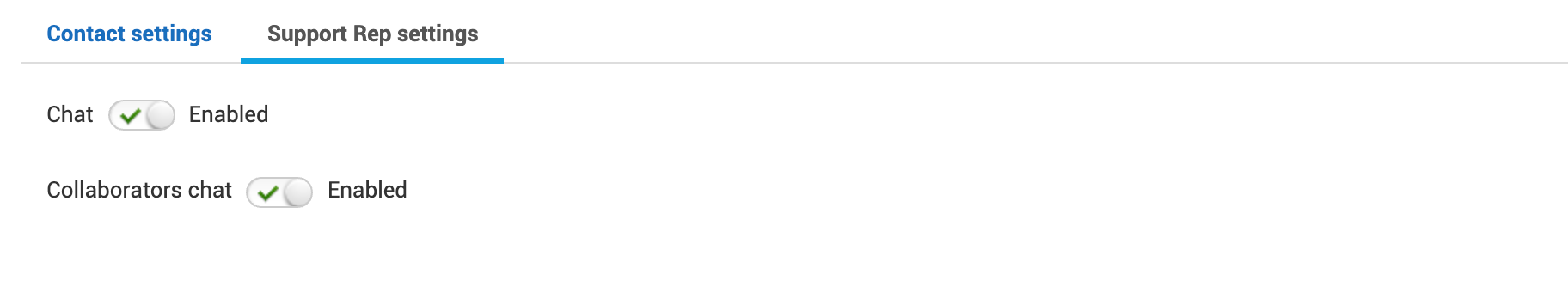 You the toggle button to enable/disable the chat for both contacts and support reps.