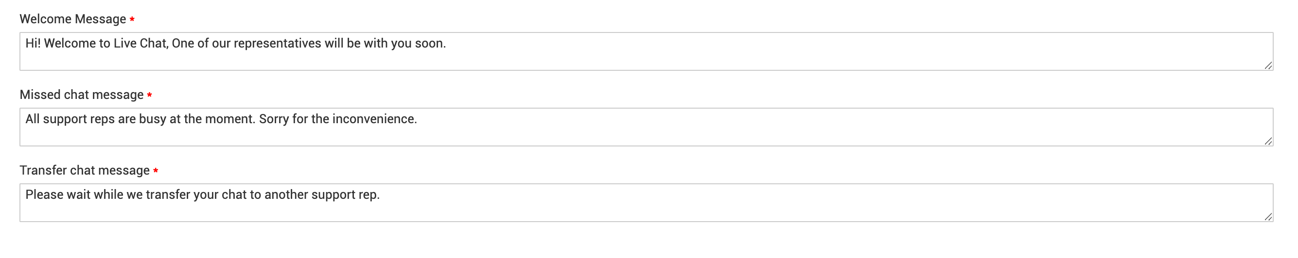 Configure Messages: Customize your Welcome Message, Missed chat message, and Transfer chat message using the respective text boxes.