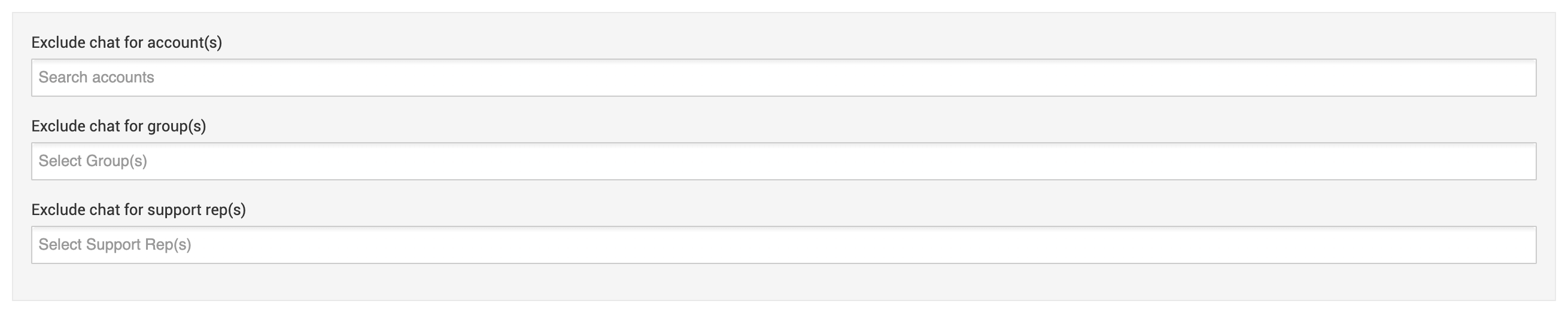 Exclusions: You can exclude chat feature for specific customer accounts, support group, or support rep. To do this, select one or more accounts, support groups, or support reps from the respective combo boxes.