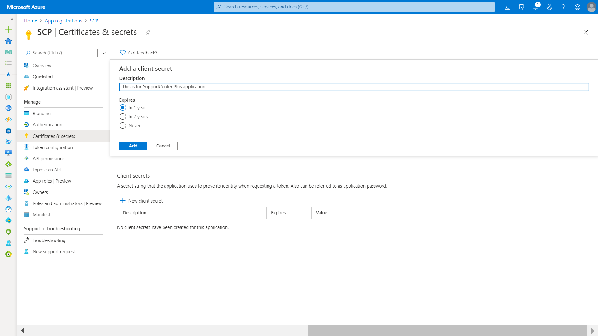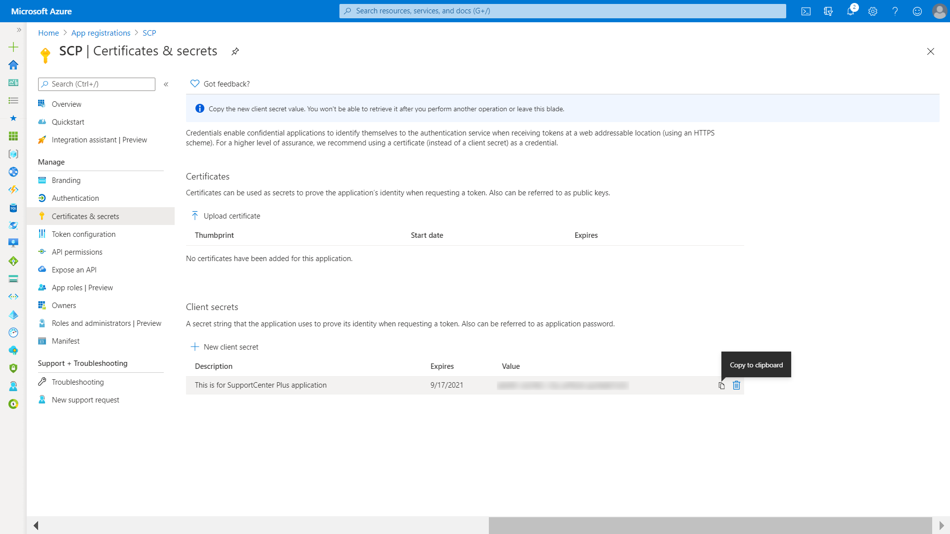 You will find the client secret generated. Copy it to the Client Secret in SupportCenter Plus.
