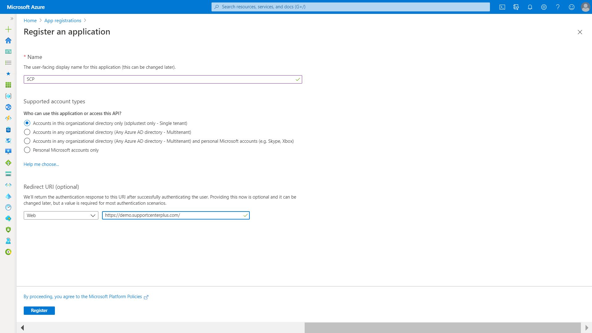 In the displayed page, enter a Name of your choice and choose the Supported account types.