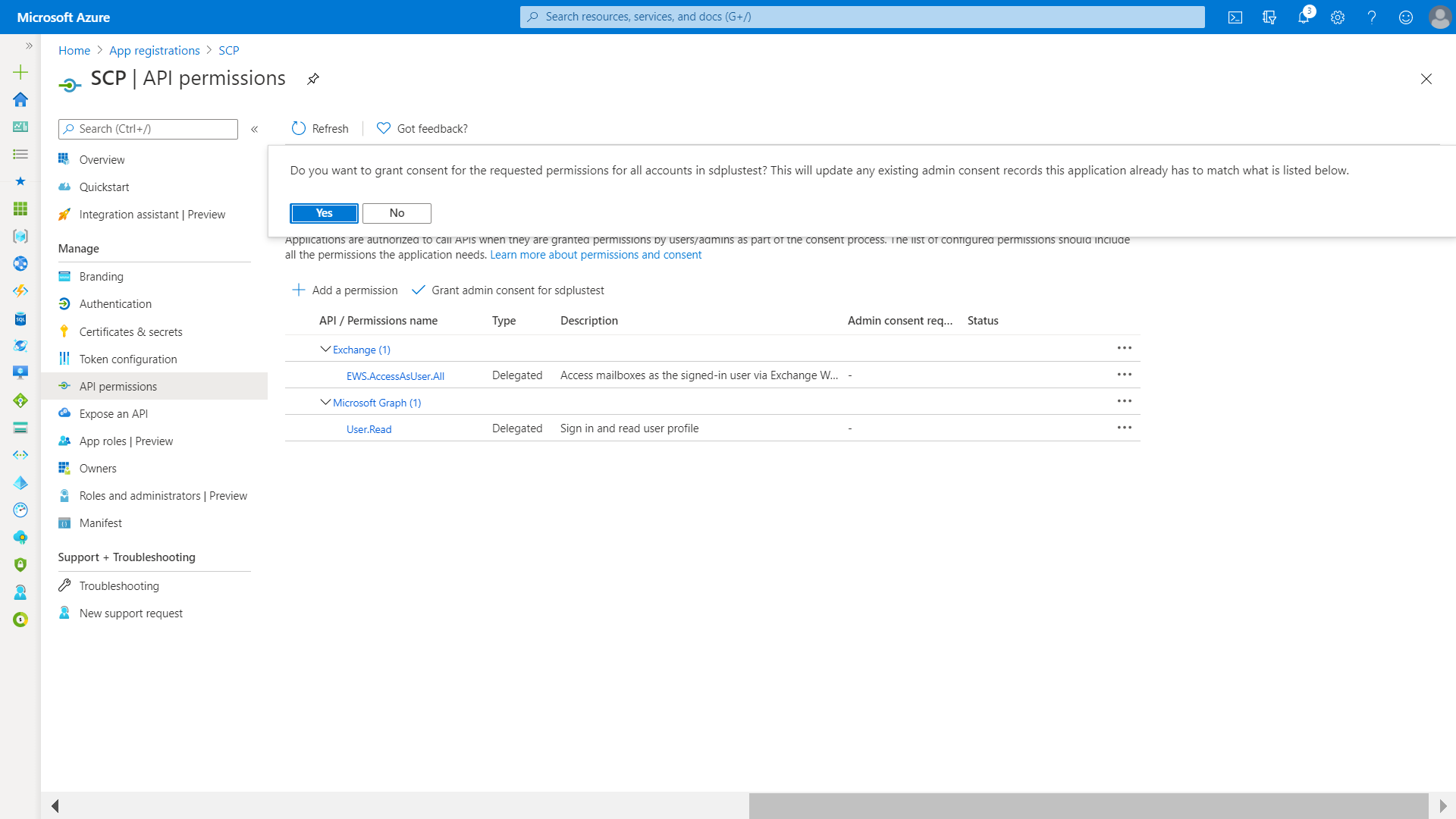 Click Grant admin consent for <application name>. A confirmation window is displayed. Click Yes to proceed.