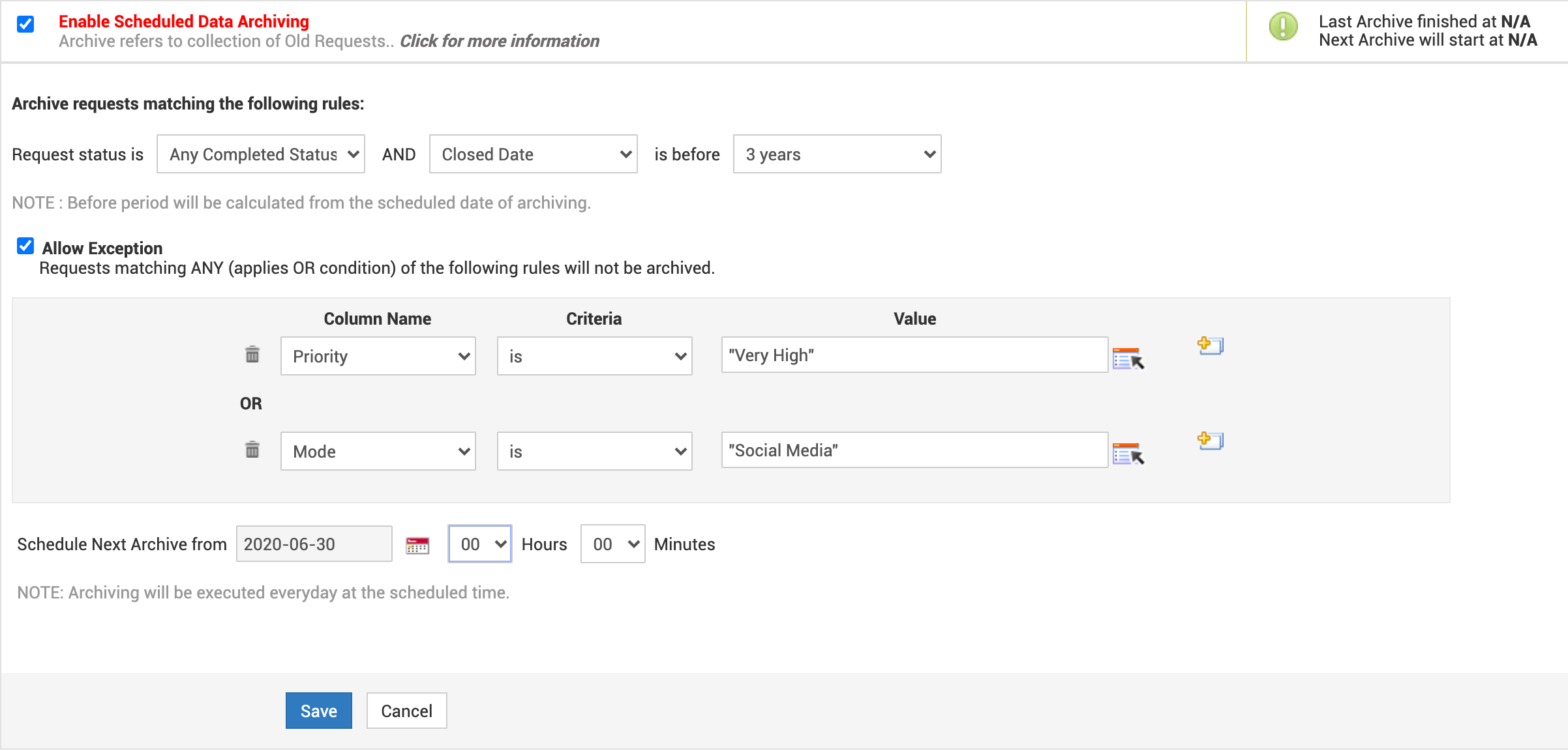 3. Configure archiving rule using request status, closing or created date and elapsed time.
