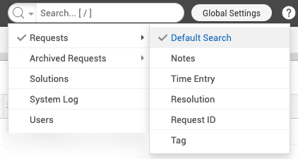 Default Search: To search all request fields. Notes: To search only notes across requests Time Entry: To search only time entry fields across requests Resolution: To search resolution fields across requests Request ID: To search only requests ids. Tag: To search only tags added to requests |