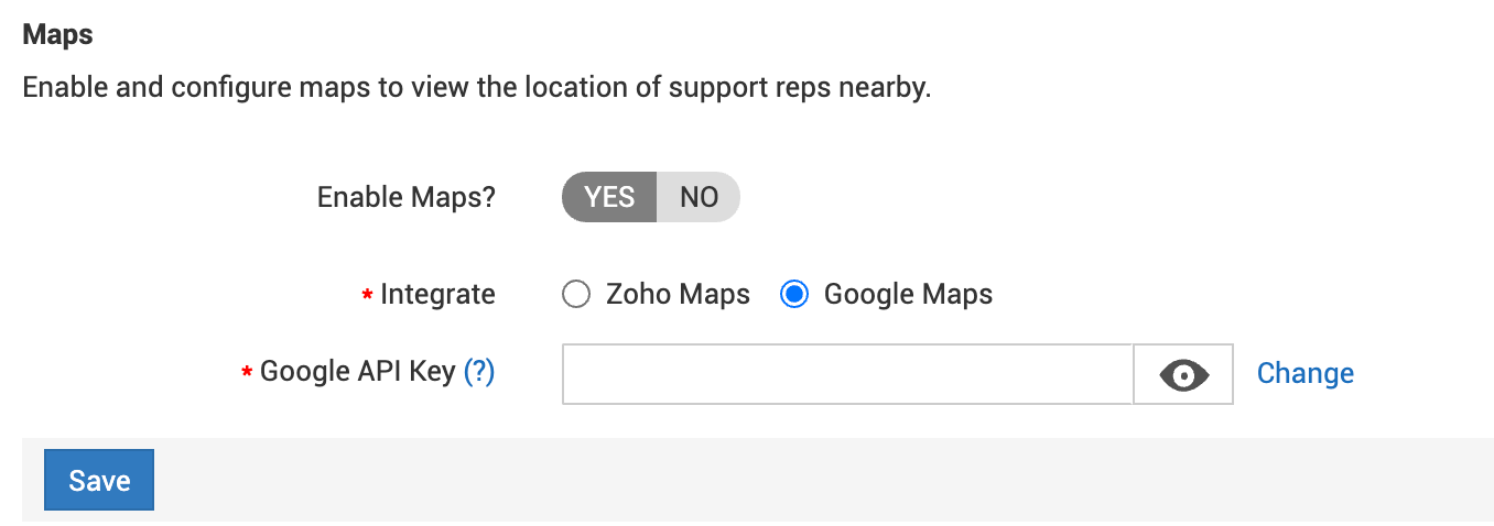3. Select Zoho Maps or Google Maps. Also, enter Google API Key if Google Maps is selected.