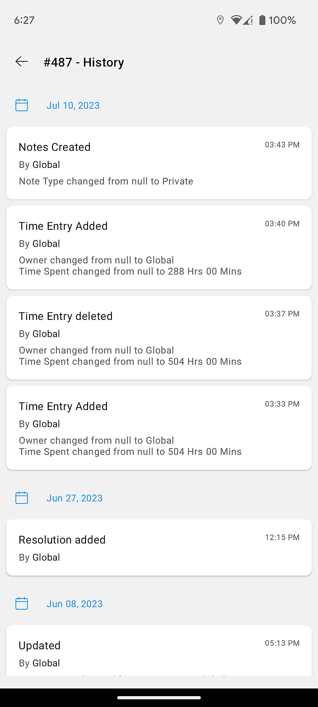 Tap the Time Entries icon. The All Time Entry List view is displayed listing all the time entries added for the request. If no time entries are added to the request, then a No Time Entry message is displayed.