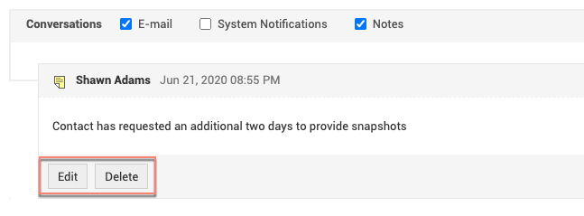 2. Select Add Notes from the Actions drop-down menu. Alternatively, you can click Add Notes in the Conversations box.