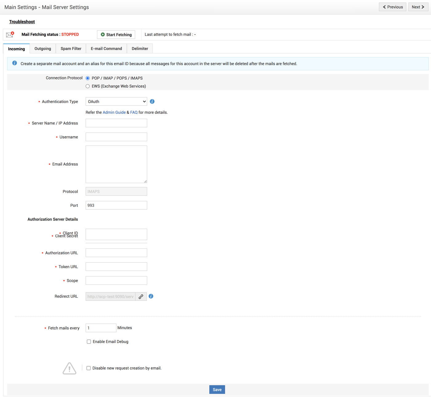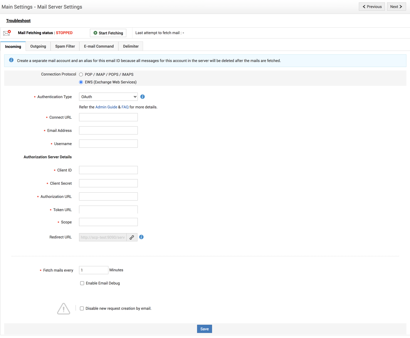 Select Disable new request creation by email if you do not wish to add incoming emails as new requests.