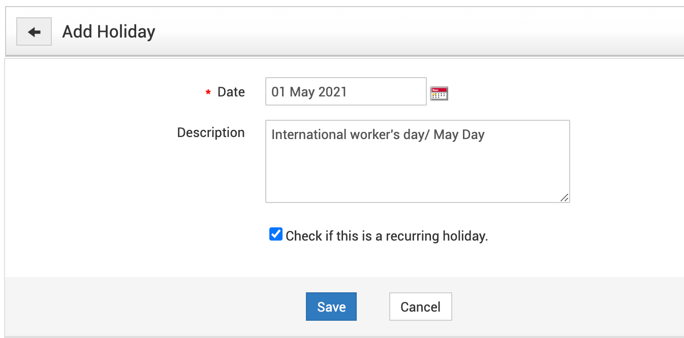 3. Now, provide Date and Description. Also, confirm if it is a recurring holiday using the checkbox.