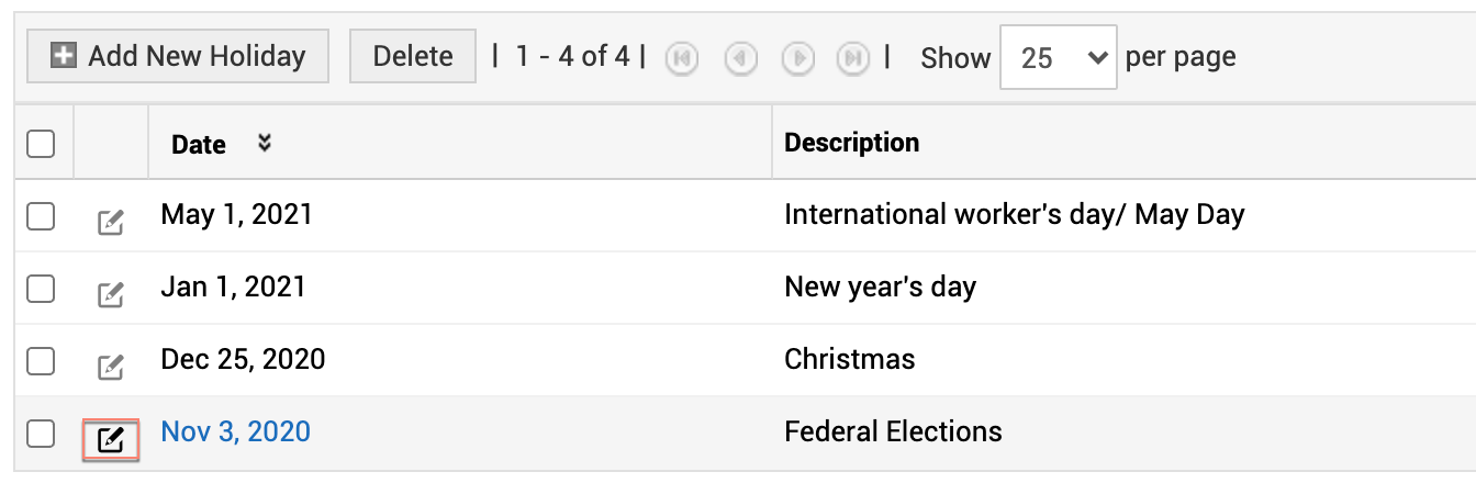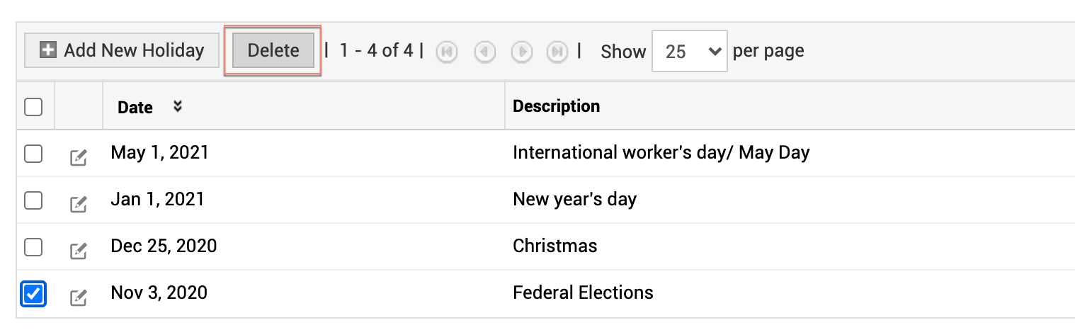 To delete leave types, select the holidays using the checkboxes and click Delete.