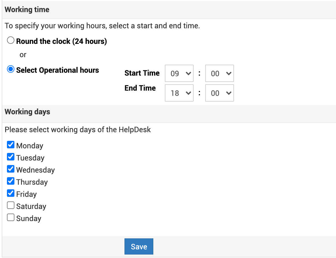 2. Choose Round the clock (24 hours) or Select Operational Hours and choose Start Time and End Time. Also, select the working days.
