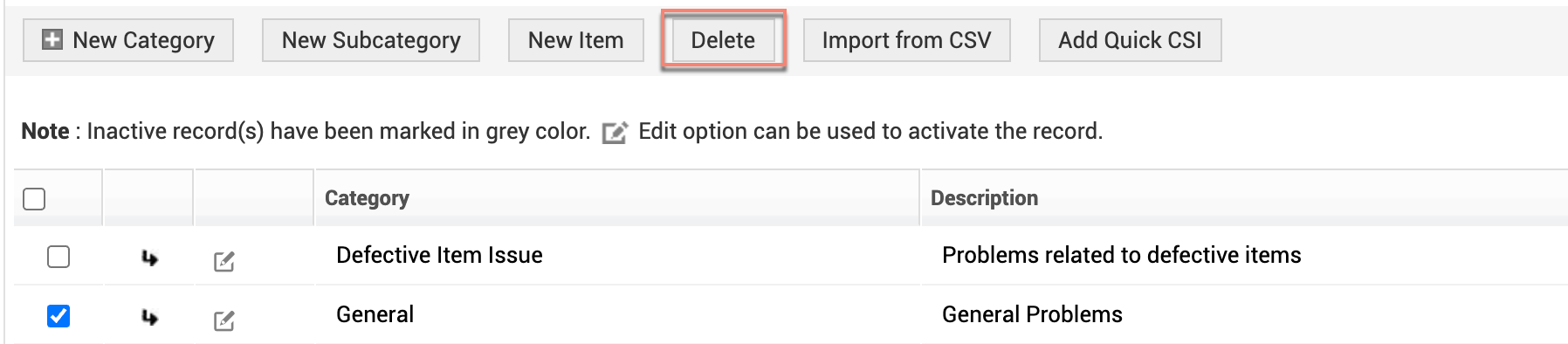 To delete, select one or more request categories using the checkboxes and click Delete.