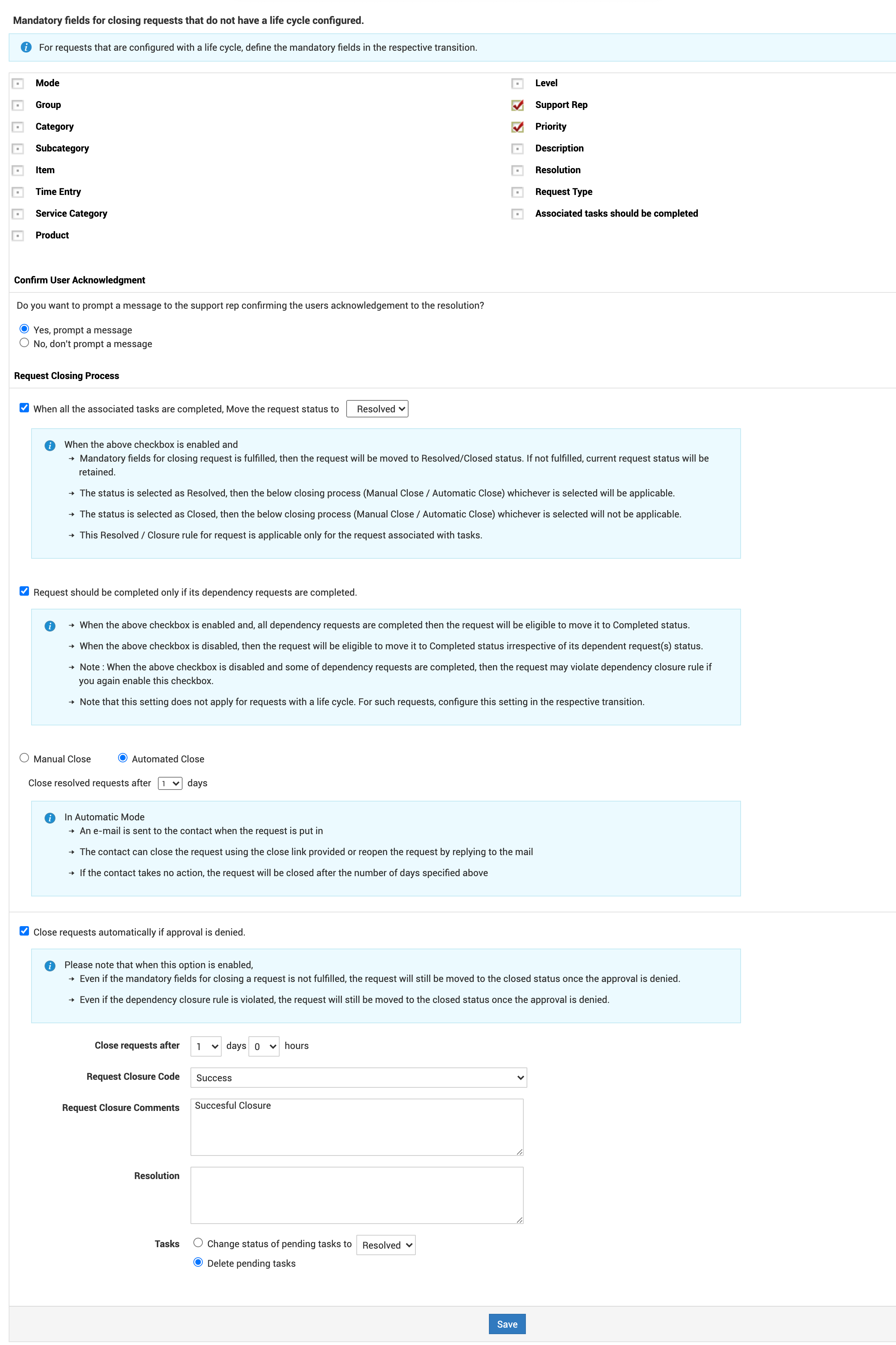 To mandate fields for closing a request, click the checkboxes against the fields of your choice. |