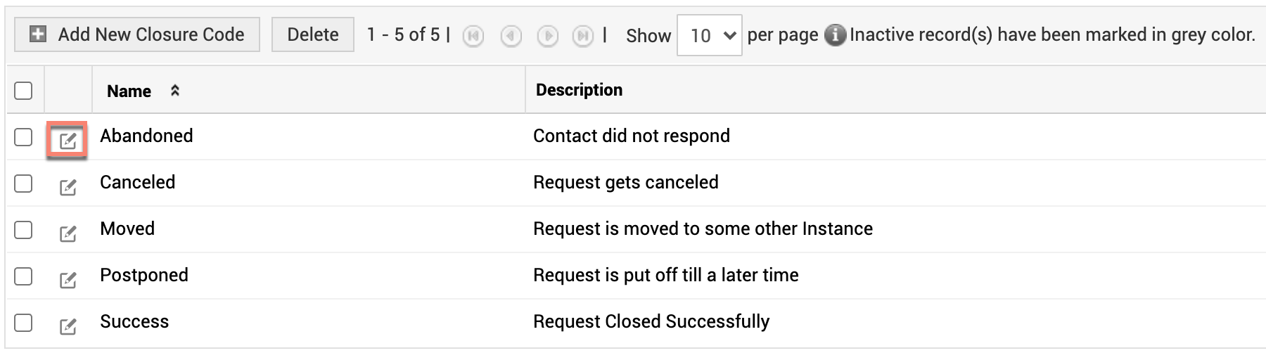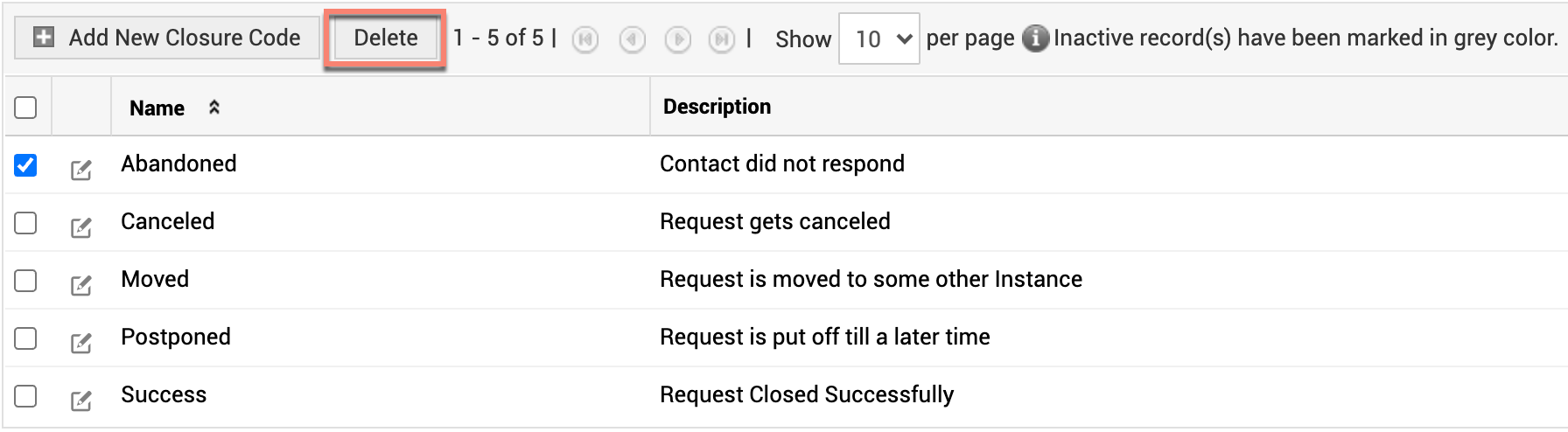 The default closure codes are Canceled, Moved, Postponed, and Success.