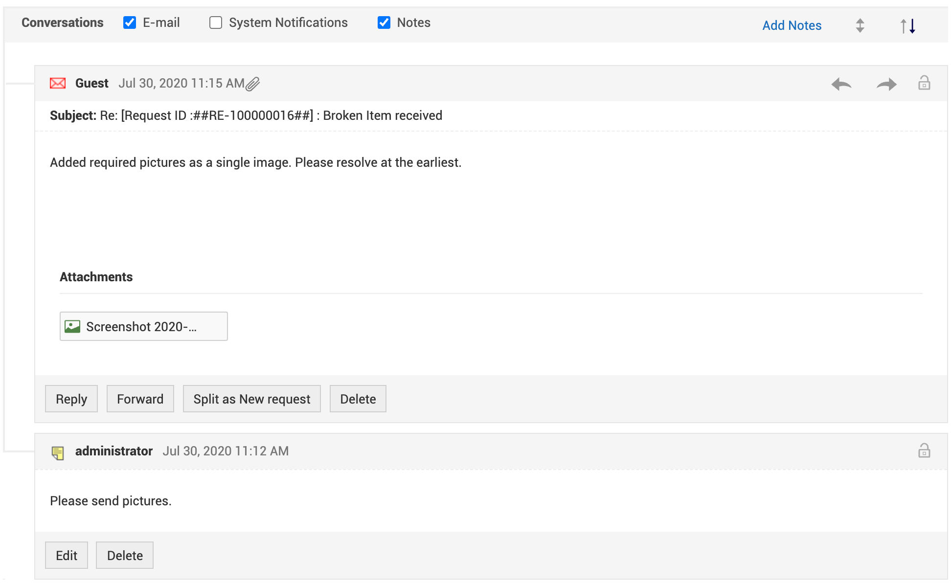 Resolving a request may involve multiple interactions between the support rep and the contact or any other person. For easy-tracking, these interactions are saved in the conversations box.