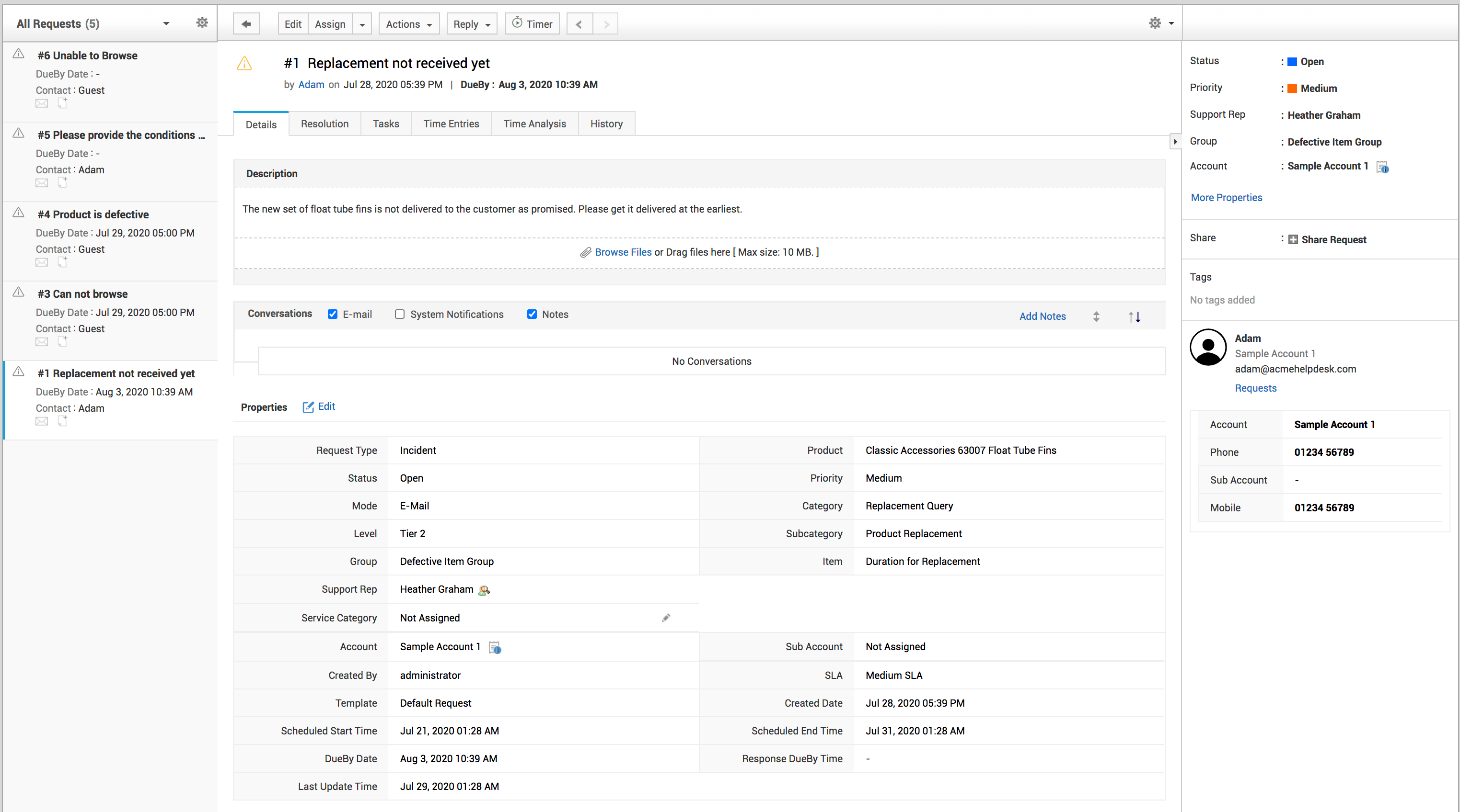 Details: This tab lists the request properties and other request details such as support rep assigned, account, template, start/end times, and so on. The request conversation and attachments are also listed in this tab. Learn more about request conversations here.