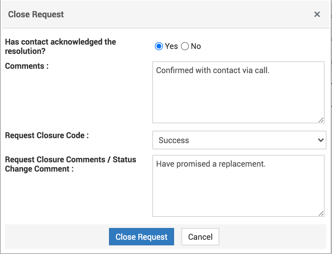 If Request Closing Rules and Request Closure Code are configured, the support rep will be prompted to add the request closing details, as shown below: