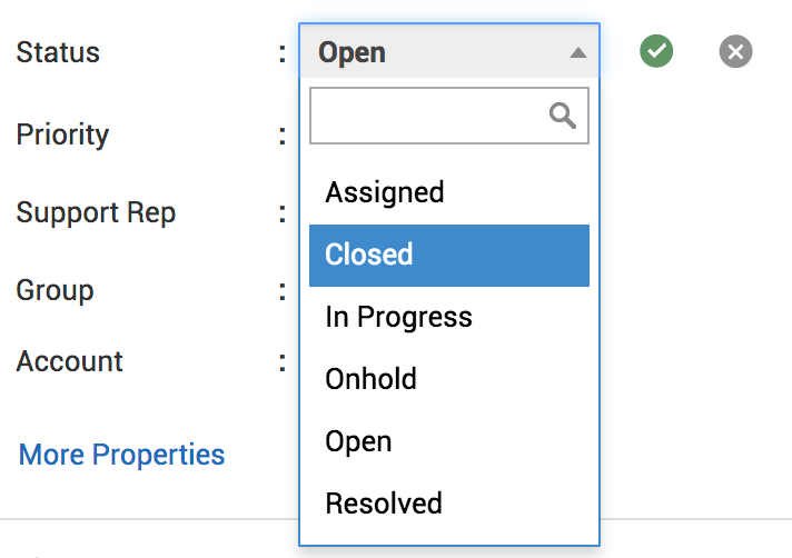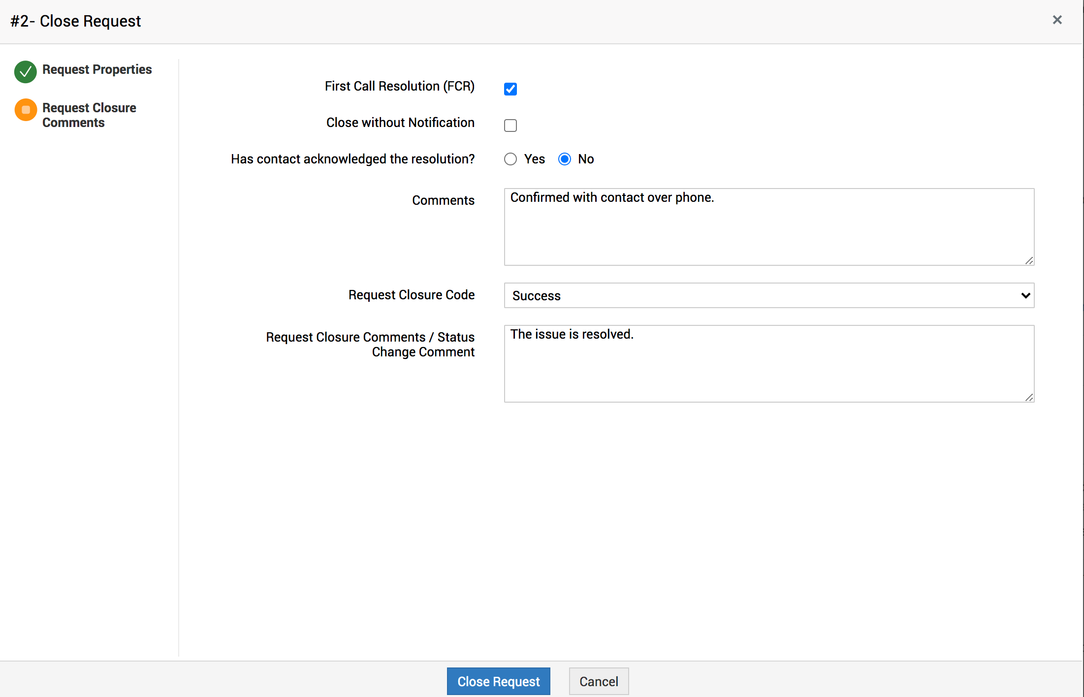 Once the request is resolved, the support rep or contact can close the request. Contacts can close the request from the email sent to them. If the contact has not closed the request, the support rep can close it from the application.