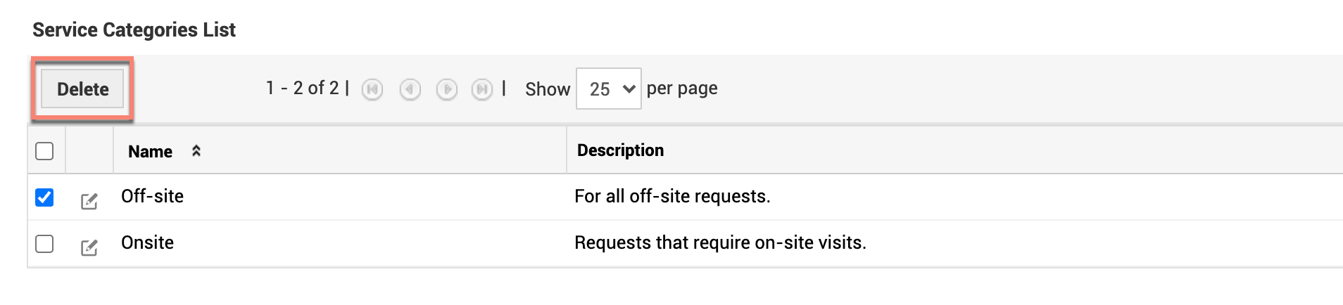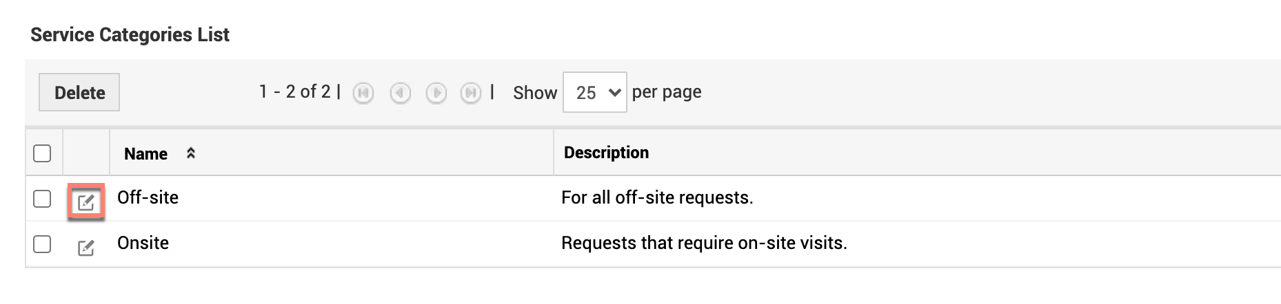 To edit a service category, click the name or the edit icon. Make necessary changes and click Save.