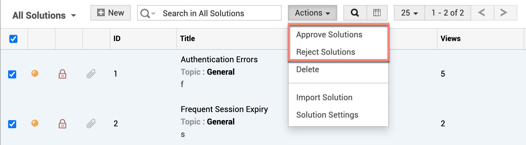 To approve or reject solutions in bulk, select one or more solution(s) from the solution list view and then select the appropriate option from the Actions drop-down menu.