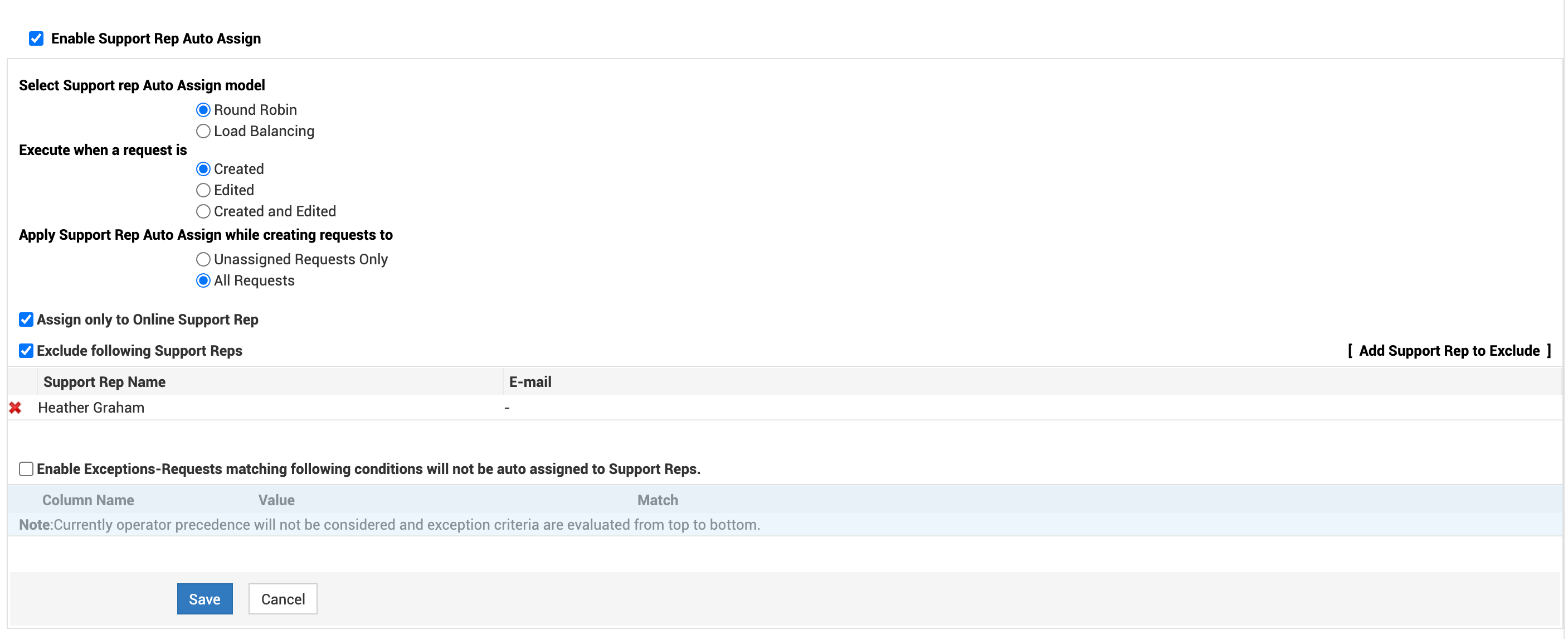 7. To exclude support reps from auto-assignment, click the checkbox Exclude following Support Reps and then click Add Support Rep to Exclude and select one or more support reps.