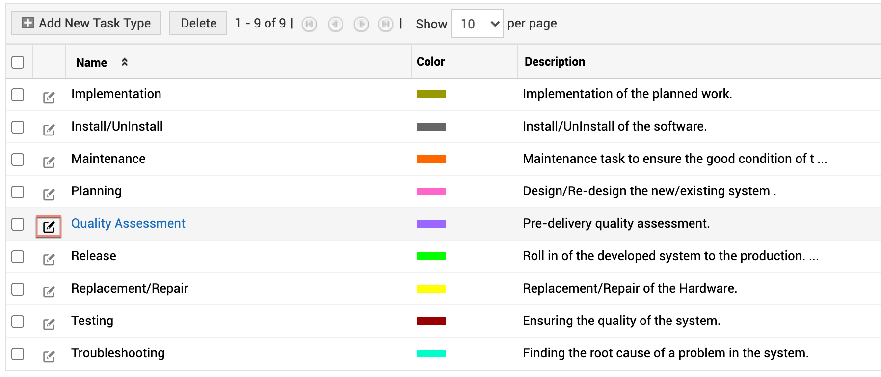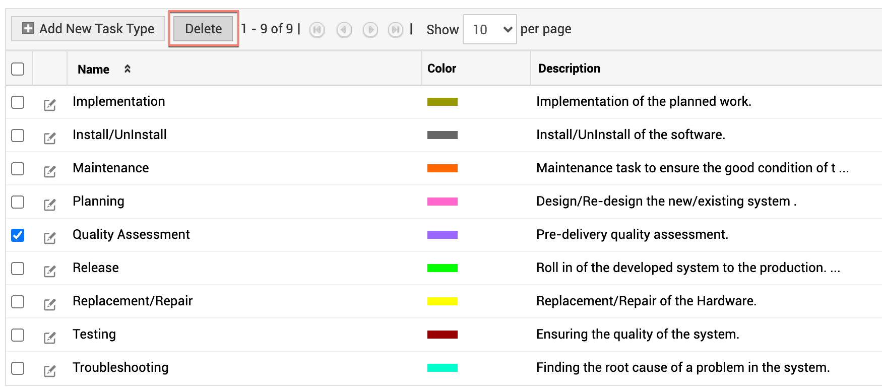 Task type allows you to group tasks of a similar type. For example, both hardware maintenance activity and database maintenance tasks can be grouped into a common type. You can create custom task types.