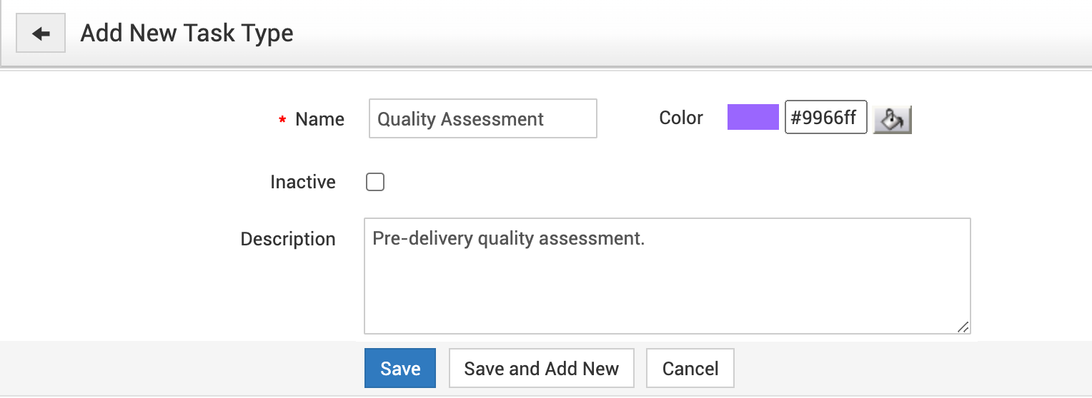 3. Now, provide Name, Description, and define a color code. You can mark the task type as inactive by selecting the Inactive checkbox.