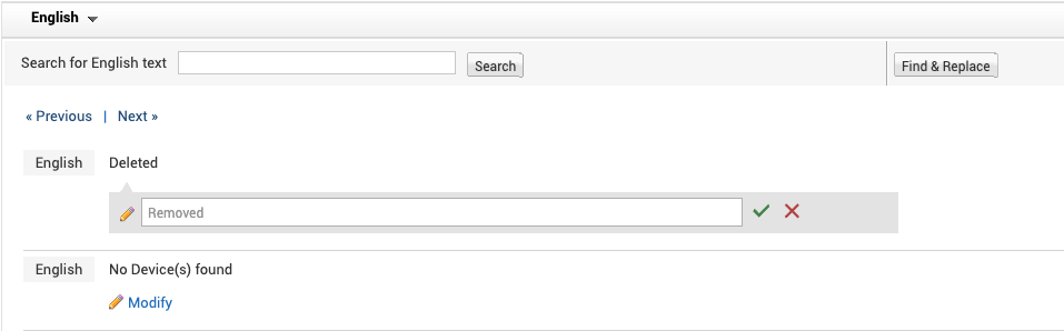 Navigate through the list of texts or use the search box to find the text that you want to be translated and click Modify. Enter the alternative text in any language and then click the tick icon.