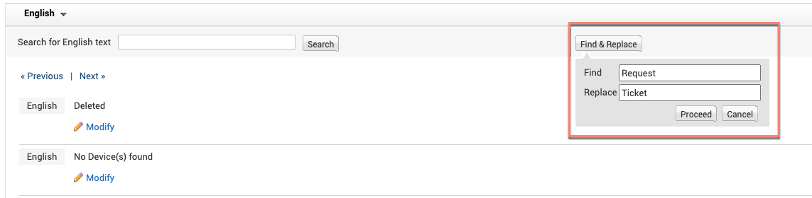 To translate texts in bulk, click Find & Replace, enter appropriate values in Find and Replace fields and then click Proceed.