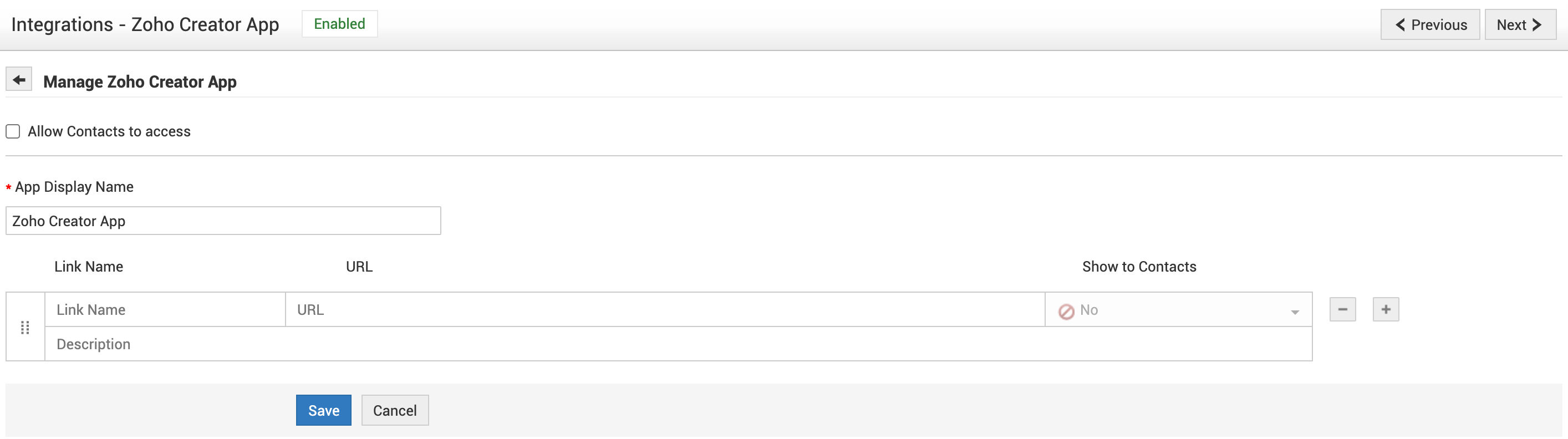 - You can enable/disable Zoho Creator integration using the dynamic button on top.